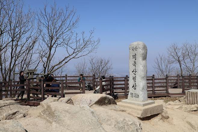 맑은 날에는 북쪽으로 낭산 채석장과 계룡산, 대둔산까지 조망할 수 있으며 서쪽으로는 군산 방향의 풍경도 볼 수 있습니다. 정상에는 벤치가 마련되어 있어 잠시 쉬며 간식을 먹거나 주변 풍경을 감상하기 좋은 공간입니다. 주말에는 가족 단위 등산객이나 혼자 산행을 즐기는 사람들도 쉽게 만날 수 있으며, 반려견과 함께 산책을 즐기는 모습도 종종 볼 수 있습니다.