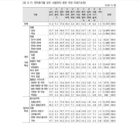 한국보건사회연구원의 보고서 설문조사 결과에 따르면 직장인이 연차를 사용하지 못한 주 원인은 직장 문화에서 비롯된 분위기와 제도의 비탄력성이 큰 퍼센티지를 차지하는 것으로 나타난다.
