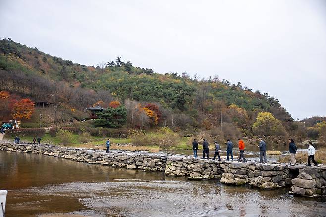겨울의 농다리는 이 다리의 본모습을 가장 잘 보여주는 시기입니다. 풀과 나무가 잎을 떨구면서 돌의 결, 교각의 간격, 물길의 흐름이 더욱 선명해집니다. 관광객이 몰리는 계절보다 한산하지만, 그 덕분에 다리 위를 천천히 걸으며 구조와 풍경을 찬찬히 살펴볼 수 있습니다.