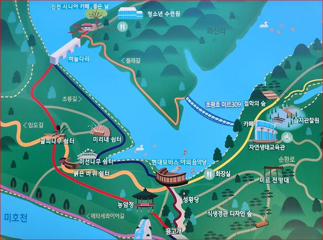 초평호를 가로지르는 미르 309 출렁다리는 초평호 산책로의 중심 포인트입니다. ‘미르’는 용을 뜻하는 순우리말로, 지역의 상징성과 자연 이미지를 함께 담고 있습니다. 출렁다리 개통 이후 초롱길, 하늘다리와 연결되는 순환 산책 코스가 완성되며 방문객 체류 시간이 눈에 띄게 늘었습니다.
