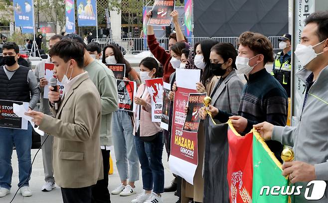 (서울=뉴스1) 장수영 기자 = 국내에 거주 중인 아프가니스탄인들이 16일 서울 종로구 광화문광장 인근에서 탈레반이 아프간 소수민족 하자라족에 자행하는 집단학살 행위를 규탄하고 있다.