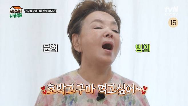 '회장님네 사람들' 출연진 김수미는 나문희를 빙의하며 "'호박고구마' 먹고 싶어"라고 말한다.