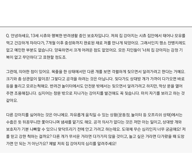 오늘 사연은 어디서나 흔히 볼 수 있는 케이스이자 반려견과 보호자 모두 당황스러운 행동 이슈인데요. 목줄이 없는 장소에서는 다른 개들과 문제없이 잘 지내면서도, 산책 시 줄을 착용했을 때만 타인/타견에 대한 반응성이 나오는 상황이에요. 이를 전문용어로는 ‘목줄 반응성’ (Leash reactive)이라고 합니다. 목줄 반응성 행동의 원인과 솔루션, 그리고 흔히 잘못 사용하여 행동을 더욱 악화시키는 훈련 방법까지 알아보겠습니다.