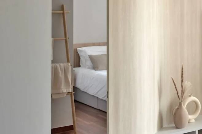 침실에 들어서면 더욱 차분하고 온화한 분위기가 느껴진다. 특히, 벽 전체를 덮고 있는 라탄 패널은 공간에 자연스러운 온기를 더한다.