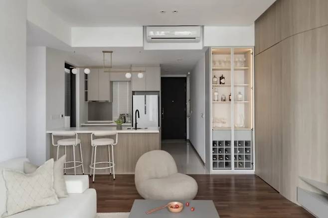 거실의 핵심은 실용성과 미적 균형을 조화롭게 담고 있다. 장식이 배제된 미니멀한 디자인 속에서 벽과 가구가 동일한 소재로 연결되어 시각적 통일감을 강조한다.