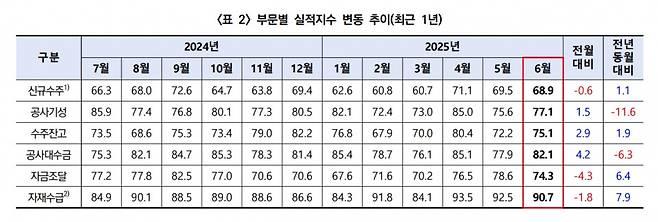 세부 지수를 살펴보면 6월 자금조달지수(74.3)가 전월 대비 4.3p 떨어지며 최대 낙폭을 보였고, 신규수주(68.9)와 자재수급(90.7)도 전월 대비 각각 0.6p, 1.8p 하락했다.