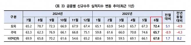공종별 신규수주의 경우 6월 토목(72.4)과 비주택건축(67.8)에서 전월 대비 각각 5.1p, 1.7p 올랐으나, 넉 달 연속 오름세를 보이던 주택(65.7)은 8.9p 크게 떨어졌다.