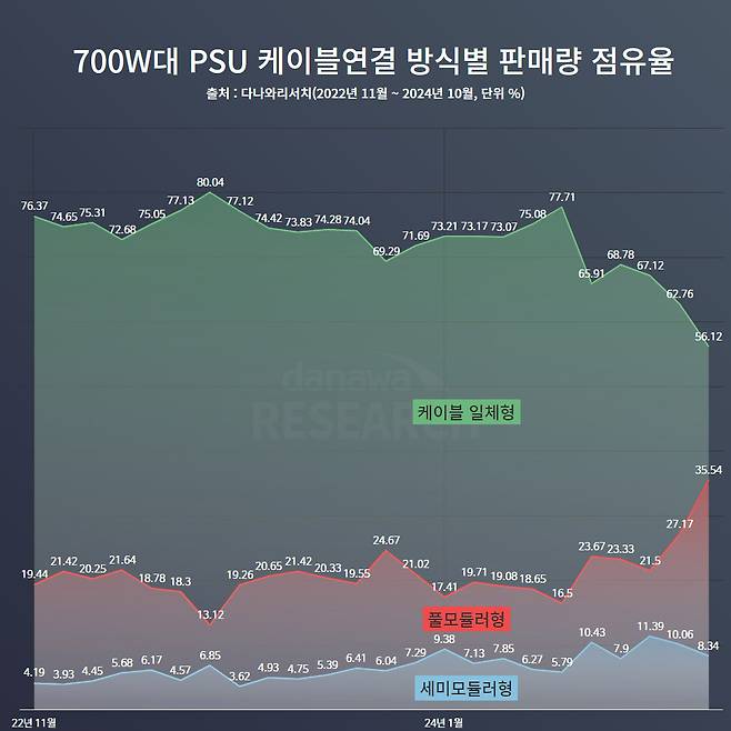 파워서플라이의 정격 출력이 높아짐과 동시에 케이블 연결 방식에도 변화가 이루어졌다. 기존엔 고급형, 고출력 제품에만 적용되었던 풀모듈러 타입이 증가한 것이다. 현재 가장 판매량 점유율이 높은 700W 대 제품만 놓고 살펴보면 1년 전 19% 정도 판매량 점유율을 보였던 풀모듈러 타입 제품의 판매량 점유율이 2024년 6월을 기점으로 급상승해 10월에 이르러 35.54%까지 증가한 것이 보인다.