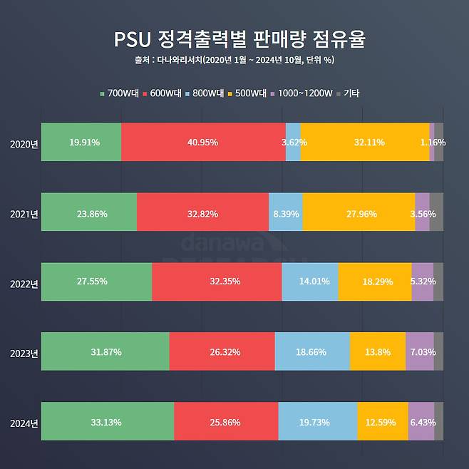 연도별로 파워서플라이의 정격 출력별 판매량 점유율이다. 4년 전인 2020년에는 600W 대 제품이 40.95%, 500W 대 제품이 32.11%, 700W 대 제품이 19.91% 점유율로 분포되었었다. 하지만, 해가 갈수록 700W 대 제품의 판매량 점유율이 올라가더니 2024년 현재 기준 700W 대 제품이 33.13%로 상승해 선두를 차지했고 800W 대 제품은 3.62%에서 19.73%로 상승해 3위까지 올랐다. 반면 600W 대 제품은 25.86%, 500W 대 제품은 12.59%까지 점유율 하락하는 모습을 보여줬다. 이는 600W 대 제품의 전성기가 지나고 700W 대로 대세가 옮겨갔음을 말해준다. 더불어 800W 제품의 급상승도 그 사실을 뒷받침해 준다.