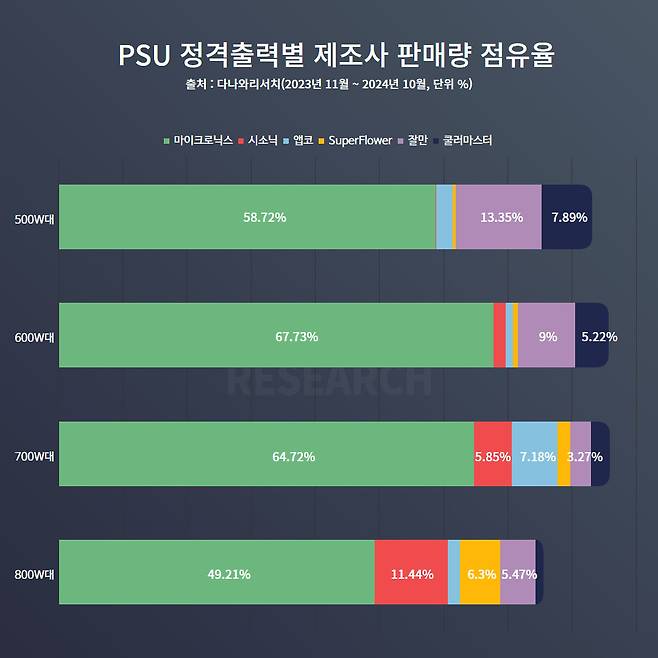 제조사별 판매량 점유율은 마이크로닉스의 독주가 돋보인다. 500W 대 제품군에서는 58.72%, 600W 대 제품군에서는 67.73%, 700W 대 64.72%, 800W 대는 49.12% 점유율로 나타났다. 거의 시장의 과반을 차지하고 있다. 1000W 이상 고출력 파워서플라이 시장에서는 시소닉과 맥스엘리트, 그리고 SuperFlower 제품이 고르게 경쟁을 펼치고 있는 것과는 상당한 차이를 보인다. 물론 잘만, 시소닉, 앱코 등이 마이크로닉스의 판매량 점유율을 따라가고 있지만 격차가 워낙 커 역전의 가능성은 적어 보인다. 성능과 스펙은 둘째치고 워낙 가성비가 뛰어난 제품을 간판 삼아 시장을 공략하기 때문에 1000W 이하 보급형 파워서플라이 시장에서의 강세는 계속 이어질 것으로 전망된다.