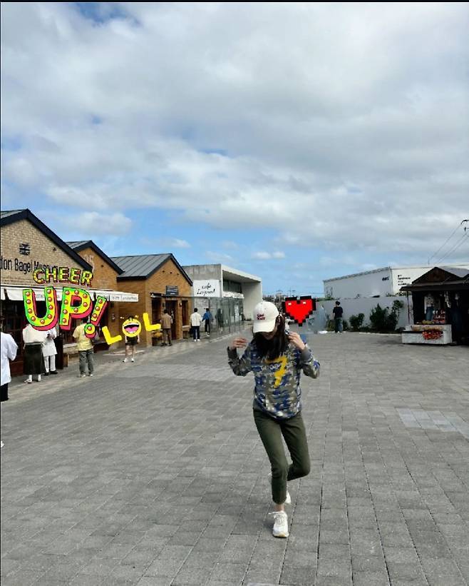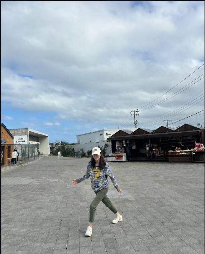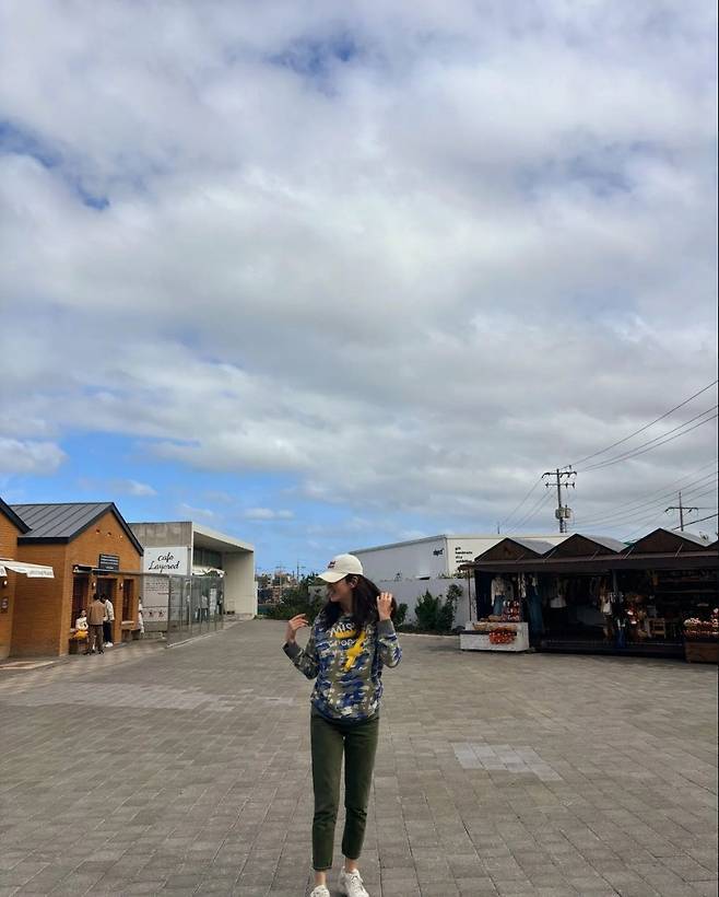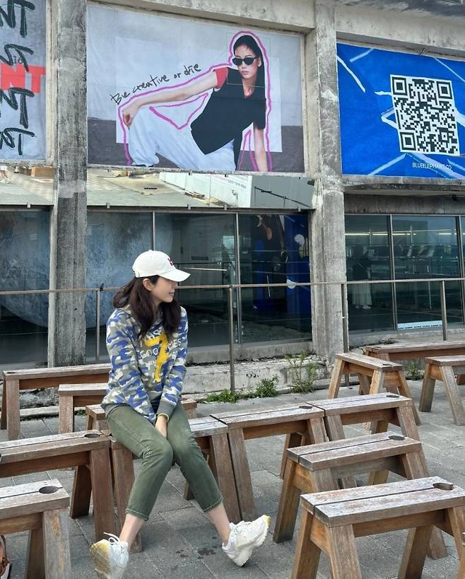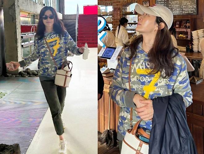 송윤아는 파란색과 회색이 섞인 카모플라주 후드티에 짙은 녹색 팬츠를 매치하여 편안하면서도 스타일리시한 외출복을 연출했습니다.