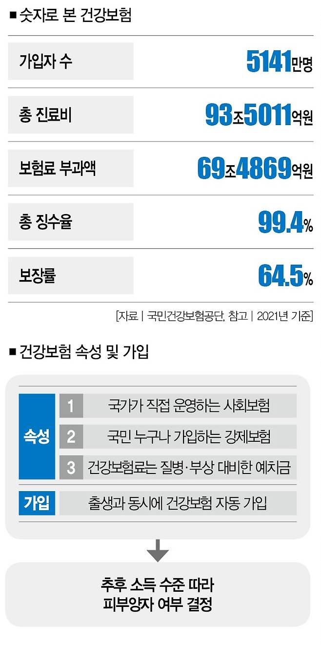 우리나라 법에도 '국내에 거주하는 국민은 특수한 경우(의료급여 수급권자, 독립유공자 등)를 제외하곤 건강보험의 가입자나 피부양자가 된다'고 명시돼 있습니다(국민건강보험법 제5조). 여기서 피부양자는 소득 수준이 일정 기준치를 충족하지 못해 가입자의 부양을 받아야 하는 사람을 뜻합니다.