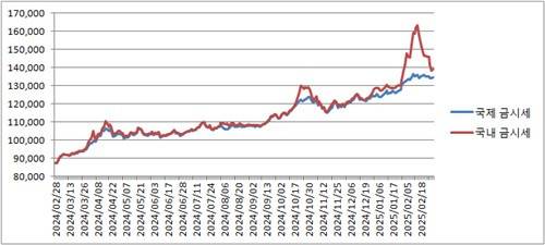 지난 14일 국내 금 시세와 국제 금 시세 간 괴리율은 장중 최고 24%에 달했고, 종가 기준으로는 20.13%에 달해 역대 최고 기록을 경신했다.