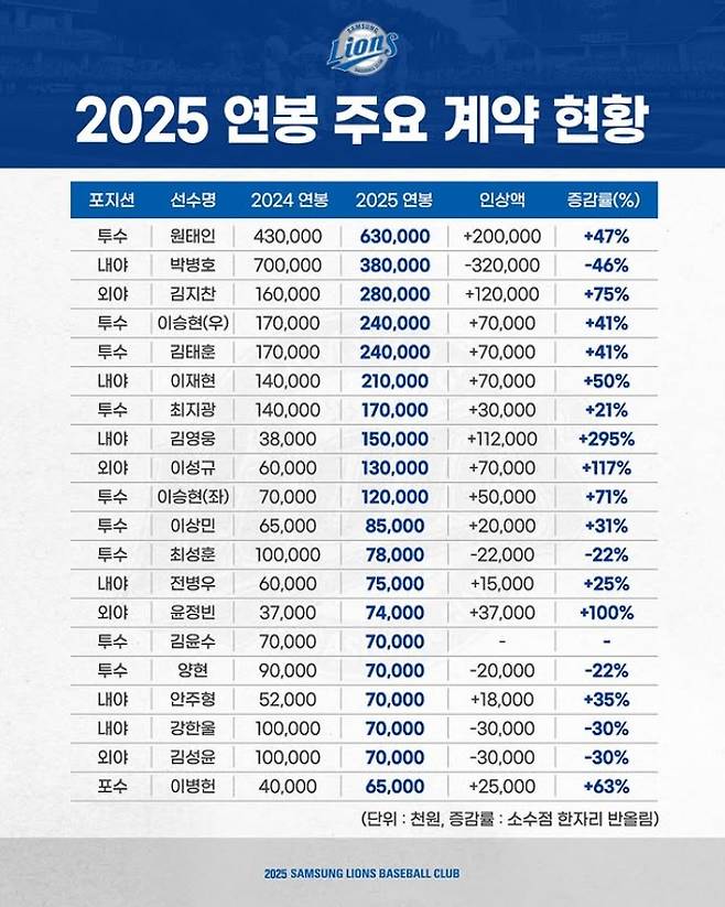 내야수 이재현은 1억4천만 원에서 2억1천만 원으로 50% 올랐고, 외야수 윤정빈은 3천700만 원에서 7천400만 원으로 100% 인상됐다.