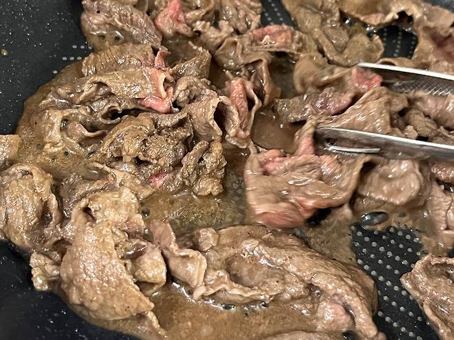 고기는 양념을 해서 살짝 볶아 줍니다. 얇은 소불고기 또는 대패 삼겹 등을 사용하시면 됩니다. 고기는 간을 너무 세게 하지 마시고, 살짝만 하여 담백하게 볶으세요.