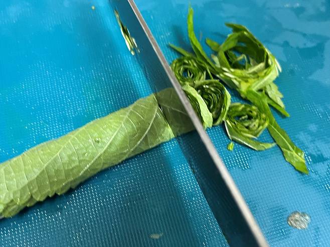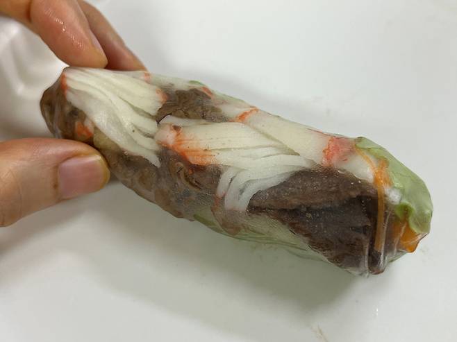 찬물에 적시면 라이스페이퍼가 딱딱한 것 같지만, 시간이 조금만 지나면 부드럽게 풀어집니다. 이때 바로 말면 찢어질 위험이 적고, 식감도 쫀쫀하게 살아 있어 훨씬 깔끔하게 쌀 수 있습니다.
