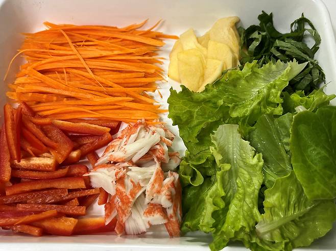 여기에 크래미, 고기, 새우 등을 추가하시면 됩니다. 또는 달달한 파인애플 등을 넣어도 잘 어울립니다. 재료는 쌈 싸기 편하게 작게 손질하면 됩니다.