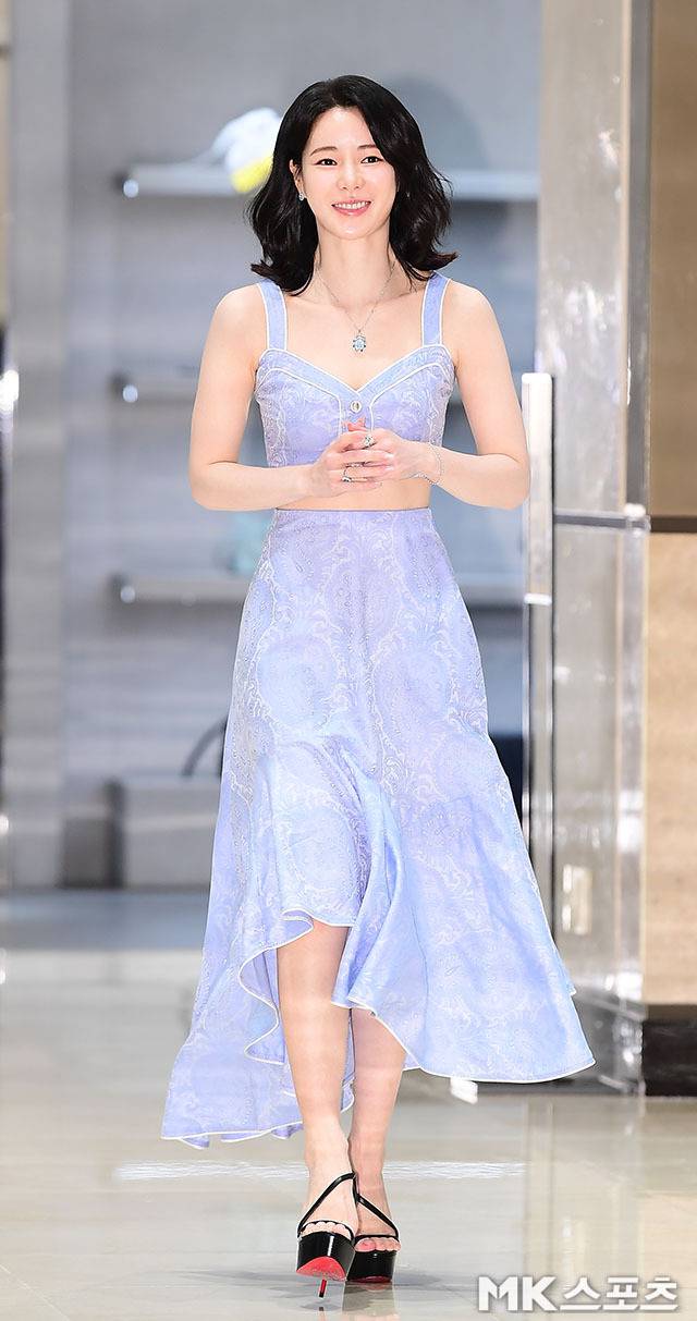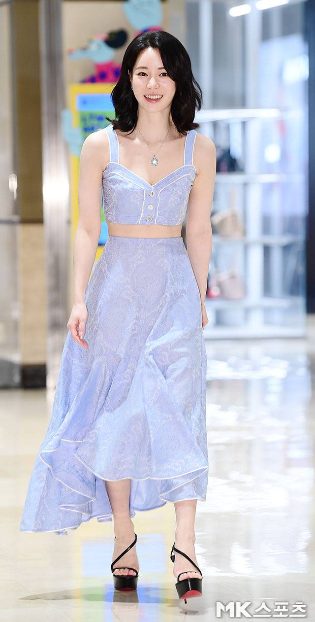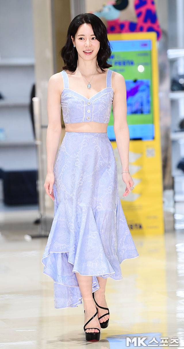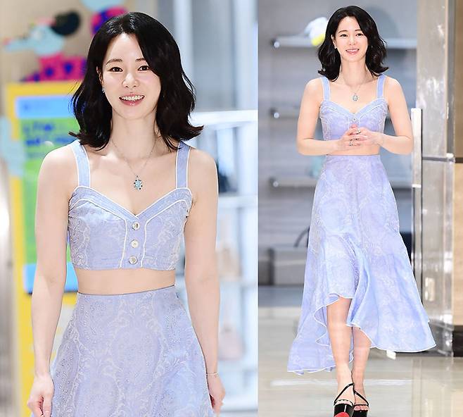 임지연은 라벤더 컬러의 크롭 톱과 롱스커트 투피스를 완벽하게 소화했습니다.