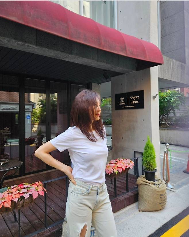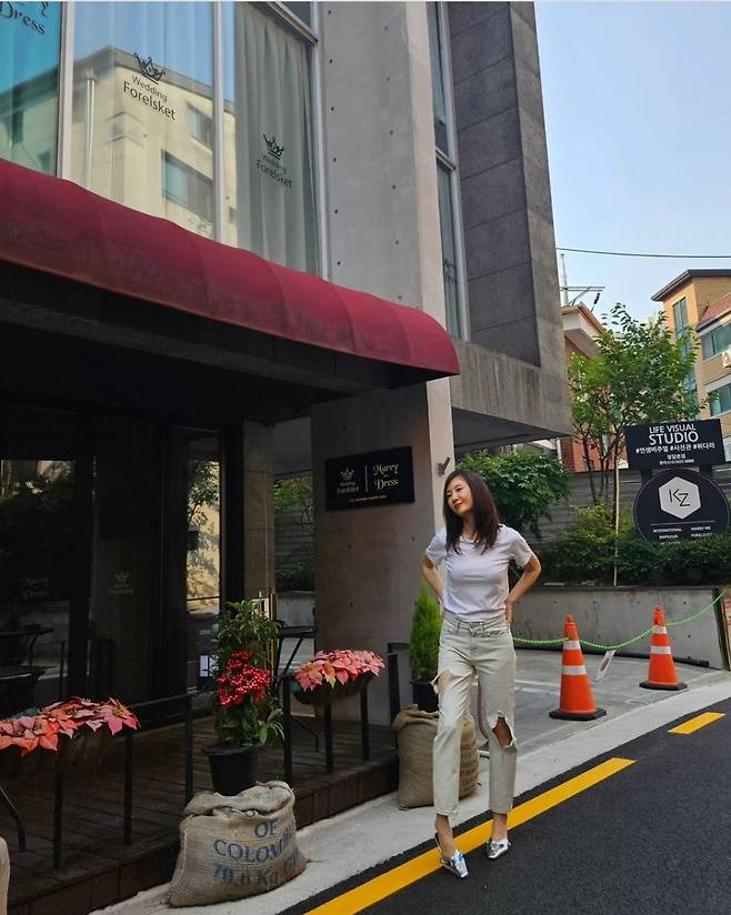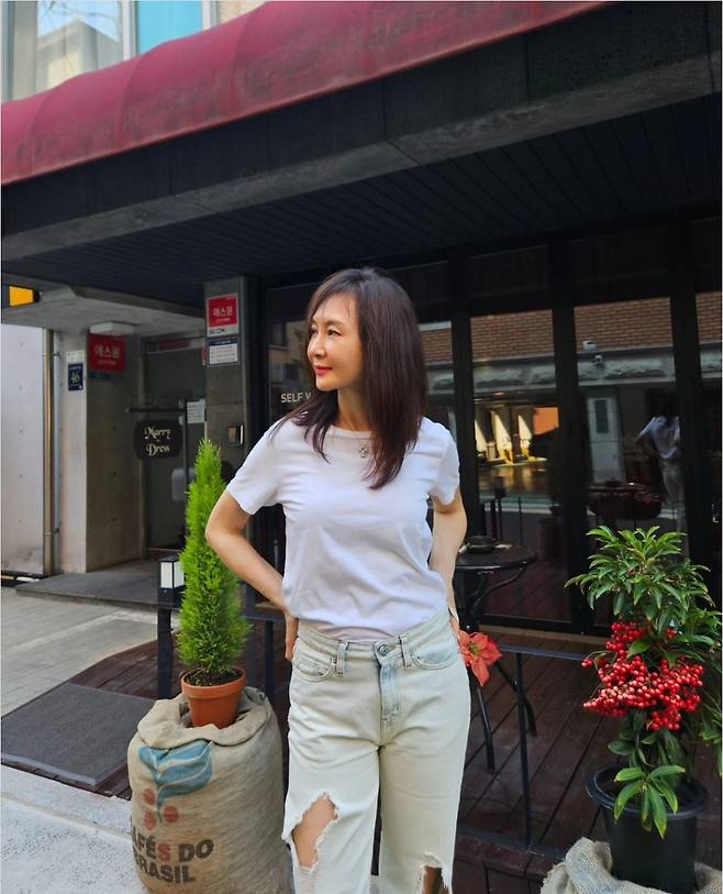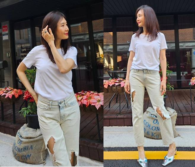 또 채시라는 찢어진 청바지를 매치해 캐주얼하면서도 트렌디한 분위기를 연출했습니다.