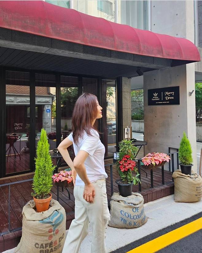 채시라는 기본적인 흰색 티셔츠를 착용해 간결하면서도 깔끔한 느낌을 주었습니다.