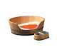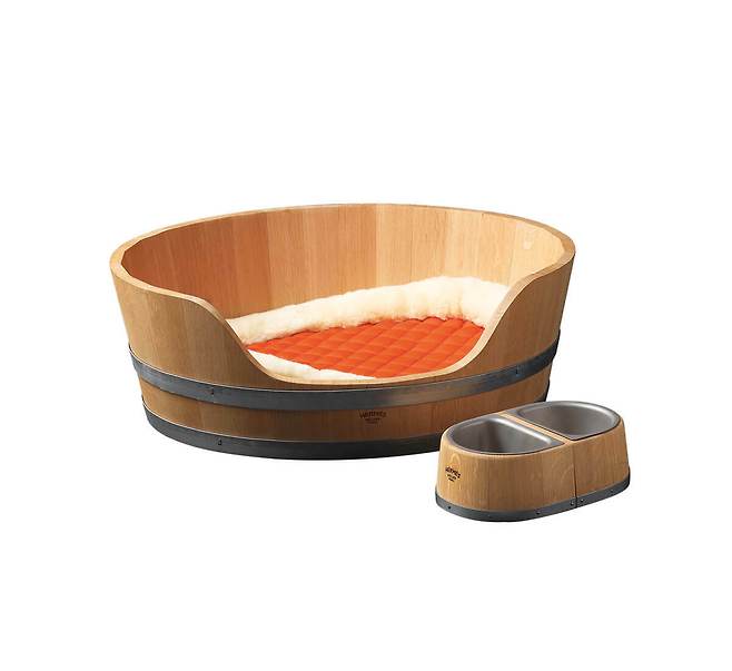 브랜드를 상징하는 오렌지 컬러와 따뜻한 오크나무 소재가 조화를 이룬 방석과 사료 통 모두 Hermes.