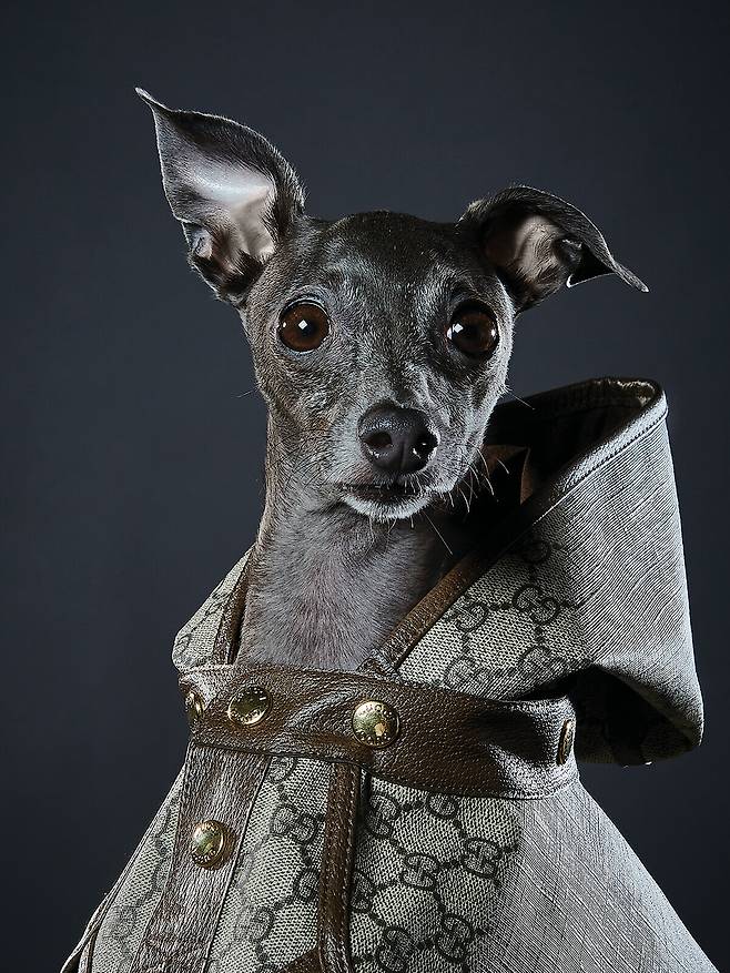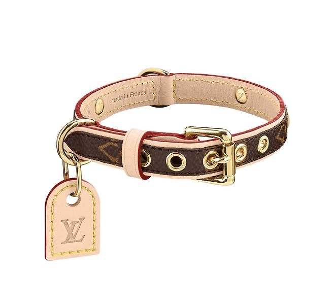브랜드를 상징하는 모노그램 패턴 캐리어와 목줄 모두 Louis Vuitton.