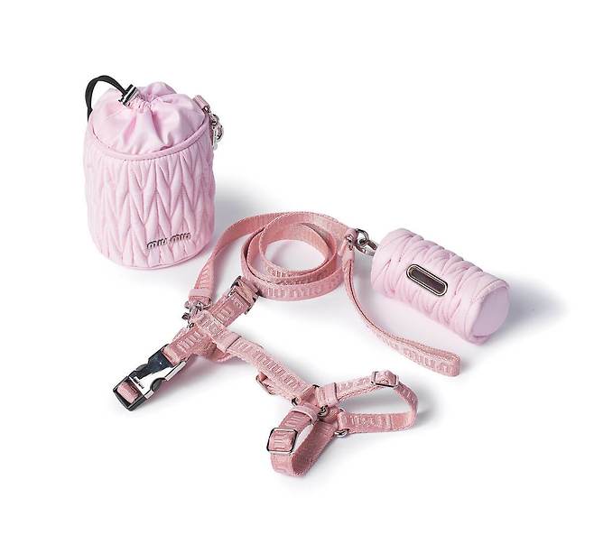 사랑스러운 베이비 핑크 하네스와 우븐 테이프 리드 줄, 건조 사료용 패브릭 파우치 모두 Miu Miu.