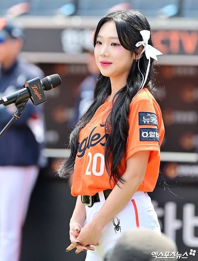 (엑스포츠뉴스 대전, 김한준 기자) 18일 오후 대전 한화생명 볼파크에서 열린 '2025 신한 SOL Bank KBO리그' SSG 랜더스와 한화 이글스의 경기, 경기 전 지아영 치어리더가 애국가 제창을 준비하고 있다.