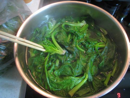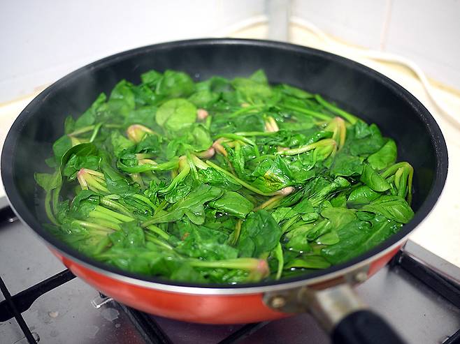 시금치는 데쳐서 찬물에 헹구는 과정이 꼭 필요합니다.