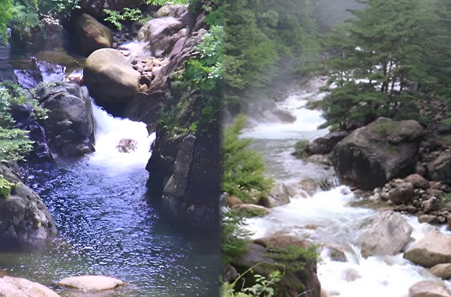 계곡은 하나의 장대한 악보처럼, 폭포와 소(沼)로 구절을 이룬다. 수증기를 머금은 공기 속에서 첫 등장하는 치마폭포는 이름 그대로 폭 넓게 펼쳐진 치맛자락 같은 곡선을 그린다. 그다음 나타나는 칠선폭포는 수직으로 떨어지는 물줄기가 웅장하진 않지만, 사계절 변치 않는 수량과 음성으로 탐방객을 압도한다.