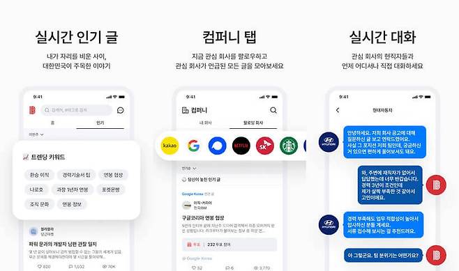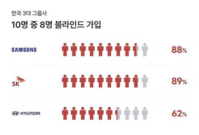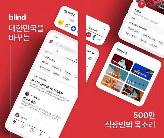 팀블라인드가 가진 가장 큰 강점은 회사의 출발점이기도 한 익명 게시판 서비스 ‘블라인드’일 것이다. 직장인 소셜 플랫폼을 표방하는 블라인드의 글로벌 가입자 수는 800만 명을 넘어선 상황이다. 회사에서 밝힌 바에 따르면 삼성과 SK, 현대자동차 재직자 10명 중 8명이 블라인드에 가입했으며, 시가총액 상위 1000대 기업 재직자로 범위를 넓히면 10명 중 9명이 블라인드에 가입한 것으로 나타난다.