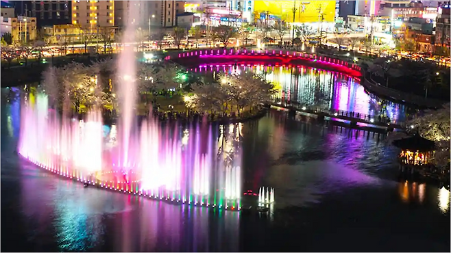 조명이 하나둘 켜지면서 수면 위에 반사되는 빛이 만들어내는 풍경은 낮과는 전혀 다른 감성을 줍니다. 여름철에는 음악분수까지 더해져, 산책이 아니라 하나의 작은 공연을 보는 느낌이 들기도 합니다.