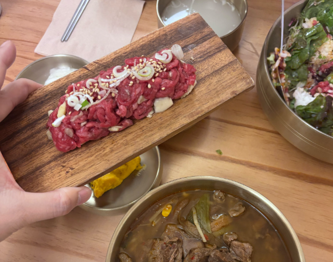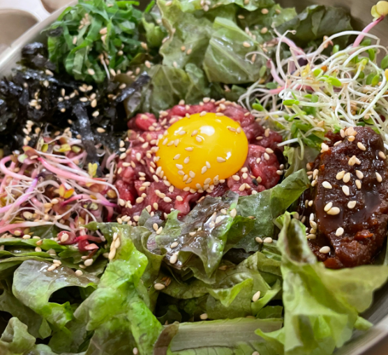 ▶ 한우육회비빔밥 16,000원 – 신선한 한우 육회와 직접 만든 약고추장을 곁들인 별미