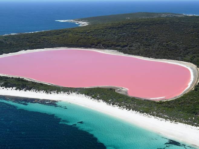 ❸ 힐리어 호수가 핑크색을 띠는 이유는 염분이 매우 높고, 박테리아, 고세균 및 여러 종의 두날리엘라 해조류 때문이라고.