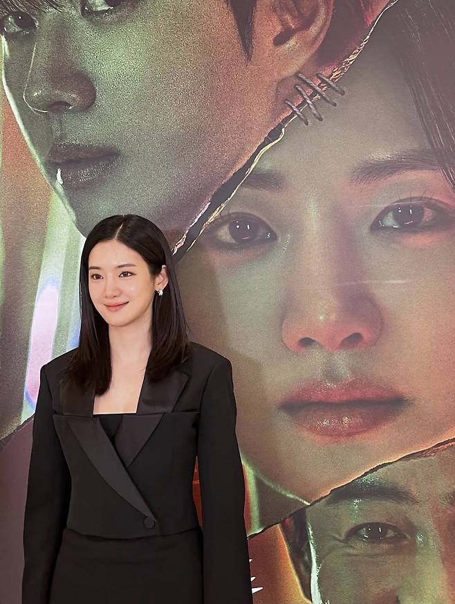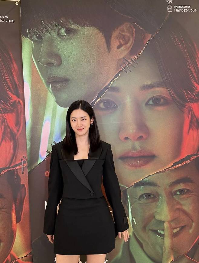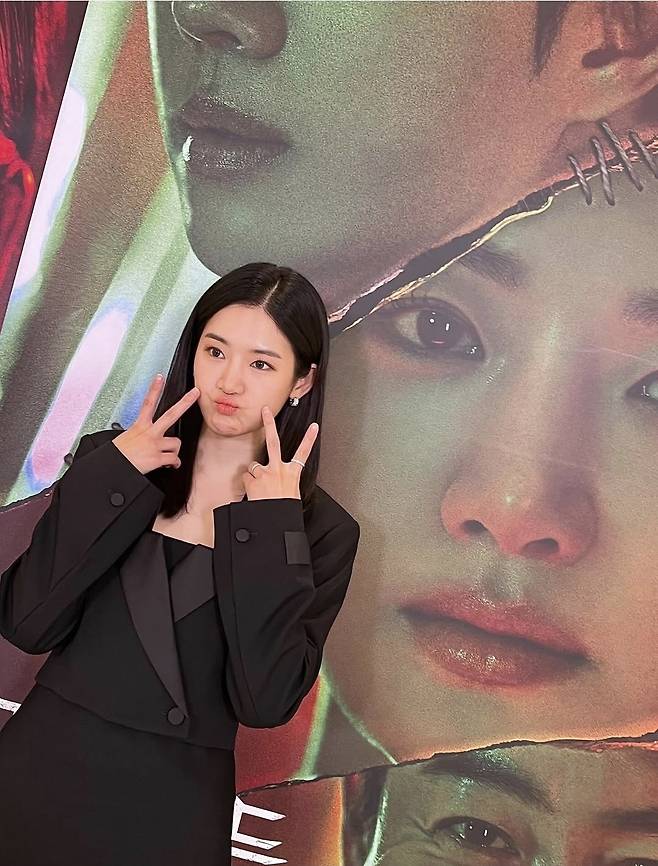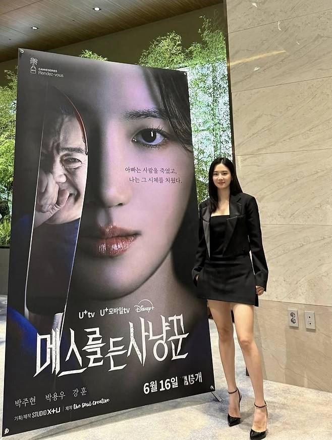 박주현은 포멀한 테일러드 재킷에 미니 원피스를 매치해 세련되고 도회적인 이미지를 강조했으며, 블랙 새틴 라펠 디테일은 고급스러운 광택감으로 룩에 깊이를 더했습니다.