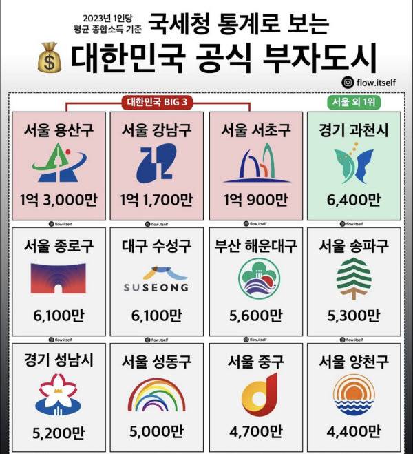 최근 온라인 부동산 커뮤니티에서 ‘대한민국 공식 부자 도시’라는 제목이 붙은 사진 자료가 주목받고 있다. 이 자료는 지난해 말 국세청이 2023년 기준 1인당 평균 종합소득금액이 가장 높은 지역을 전국 229개 시군구별 순위로 정리해 발표한 자료를 기반으로 제작된 것이다. 상위권에 자리잡은 지역 모두 대체로 집값이 높기로 손꼽히는 곳들이라 국민들의 공감이 쏟아지는 분위기다.