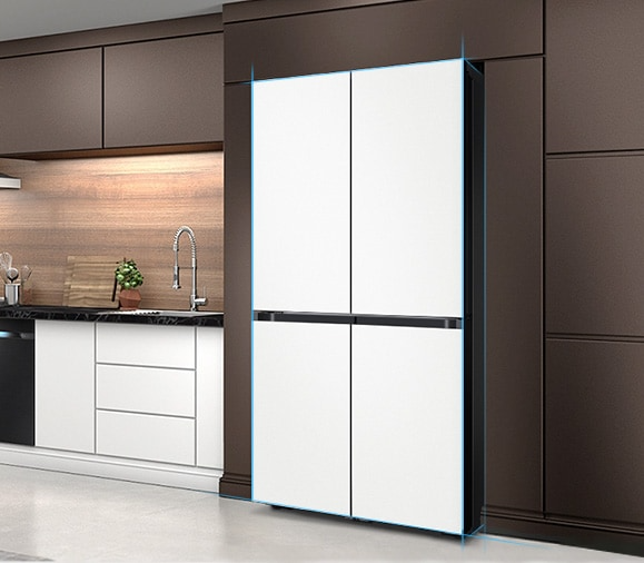 615L 용량에 4도어를 가진 삼성 비스포크 키친핏은 377L 냉장실, 119L 냉동실에 7단계 온도 설정이 가능한 119L 맞춤보관실까지 제공해, 보다 다양한 음식을 딱 맞는 온도로 보관할 수 있는 제품이다. 화이트 와인이나 맥주는 물론, 냉동실 용량이 부족할 경우에는 냉동실처럼 활용할 수 있어 더욱 유용하다. AI 절약 모드로 효과적인 에너지 절약이 가능하며, 비스포크 모델인 만큼 전면 패널은 다양한 소재와 컬러를 취향에 맞게 선택할 수 있다.