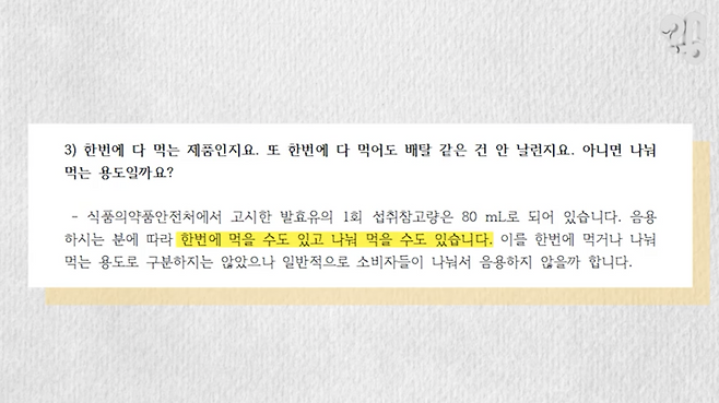 한 번에 다 먹어도 되느냐는 질문에 대해선 “한 번에 먹거나 나눠 먹을 수도 있지만 식약처에서 고시한 발효유의 1회 섭취 참고량이 80㎖이기 때문에 나눠서 마시지 않을까 싶다”는 답변이 서울우유로부터 왔다. 큰 사이즈로 팔기는 하지만 냉장 보관해가며 식약처 권고만큼 적당히 먹으라는 얘기다.