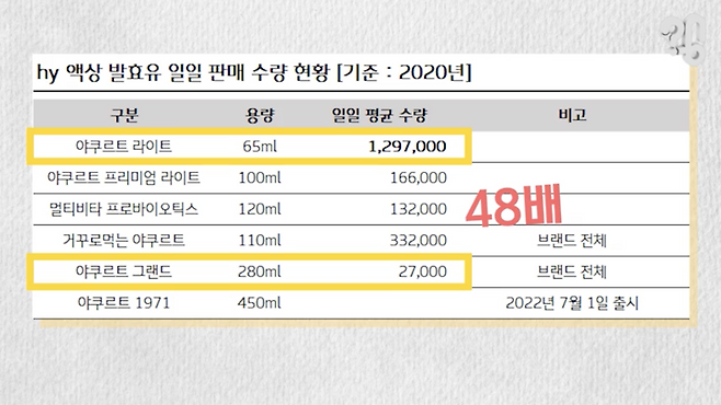 그래서 이번 영상의 주제도 이 연주황색 요구르트의 시그니처인 65㎖ 사이즈다. 뒤에서 설명하겠지만 65㎖ 작은 사이즈 말고도 280㎖, 750㎖ 등 다양한 대용량 요구르트들이 최근 출시되고 있지만 여전히 65㎖ 제품이 압도적으로 팔리고 있다. 이건 2020년 hy(옛 한국야쿠르트)의 야쿠르트 사이즈별 일일 판매 통계인데 야쿠르트 그랜드(280㎖)가 하루 2만7000병 팔릴 동안 라이트(65㎖) 사이즈는 129만7000병이 팔렸다. 48배 차이가 난다.