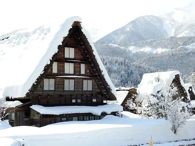 기후현 산간에 자리한 시라카와고는 겨울이 되면 완전히 다른 세상이 됩니다. 갓쇼즈쿠리 양식의 초가집들이 하얀 눈에 덮이며, 마을 전체가 한 폭의 설경으로 바뀝니다. 경사가 급한 초가지붕은 폭설을 견디기 위해 만들어진 구조로, 눈이 많이 내릴수록 이 마을의 진짜 모습이 드러납니다.