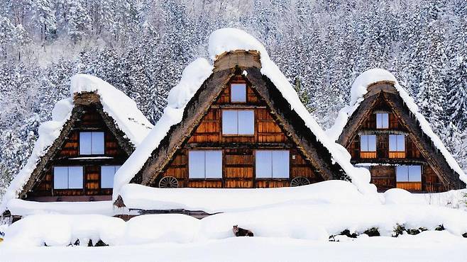 기후현 산간에 자리한 시라카와고는 겨울이 되면 완전히 다른 세상이 됩니다. 갓쇼즈쿠리 양식의 초가집들이 하얀 눈에 덮이며, 마을 전체가 한 폭의 설경으로 바뀝니다. 경사가 급한 초가지붕은 폭설을 견디기 위해 만들어진 구조로, 눈이 많이 내릴수록 이 마을의 진짜 모습이 드러납니다.