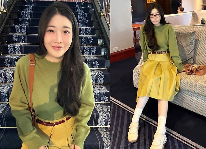 이해리는 부드러운 올리브 그린 니트에 머스터드 톤의 A라인 플리츠 롱스커트를 매치해 봄날의 햇살처럼 따뜻한 분위기를 완성했습니다.