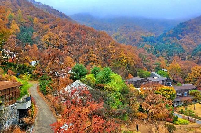 전화와 인터넷, SNS가 금지되어 전자제품으로부터 멀어지는 디지털 디톡스 명소로도 유명한 힐리언스 선마을은 가을이 되면 낭만적인 풍경을 선사해 속세를 잊게 만드는 힘이 있다.