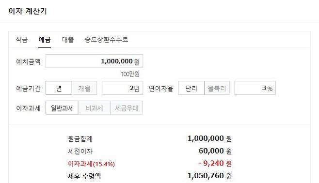 2)똑같은 조건인 원금 100만원 연 이율 3% 만기 2년이라면?