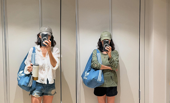 화이트 셔츠와 데님 쇼츠를 조합한 여름철 캐주얼 룩을 선보이고 있다. 베이지 컬러 캡으로 스포티한 느낌을 연출하며, 아디다스 블루 숄더백을 매치해 활동적인 이미지를 강조하고 있다. 루즈핏 화이트 셔츠의 자연스러운 실루엣이 편안함과 여유로움을 동시에 표현하고 있다.