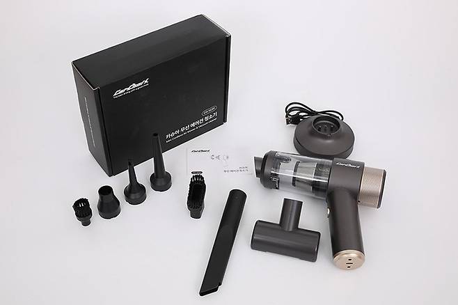 구성품은 제법 푸짐하다. 청소기 본체 이외에도 청소 노즐 2가지와 청소 노즐용 브러시, 에어건 노즐 3가지와 에어건 노즐용 브러시, 유선 충전 거치대, 그리고 사용 설명서가 기본 제공되고 있다.