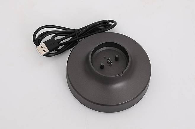 함께 제공되는 충전 거치대를 보면 윗면 가운데에 USB C타입 커넥터가 돌출되어 있으며, 커넥터 양쪽 옆으로 두 개의 작은 원기둥이 튀어나와 있다.