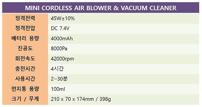 요즘 미니 청소기에 에어 블로우 기능이 추가된 에어건 청소기가 인기를 끌고 있다. 청소기의 구조상 공기를 흡입하면 배출도 꼭 필요하기 때문에 이를 이용해 에어건 기능을 추가할 수 있는데, 흡입력이 강할수록 배출되는 공기도 빨라져서 에어건 기능도 더욱 강력해진다. 카슈아 에어건&미니 청소기 엔더스트는 8000Pa의 강력한 흡입력으로 에어건으로도 상당히 만족스러운 성능을 제공해주는 제품이다.