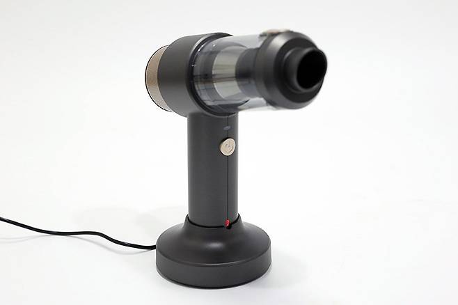 충전 거치대에 청소기를 끼워 넣으면 세워진 상태로 충전이 바로 진행된다. 충전이 진행되는 동안은 손잡이 하단의 상태 표시등이 적색으로 켜지며, 충전이 완료되면 녹색으로 바뀐다.