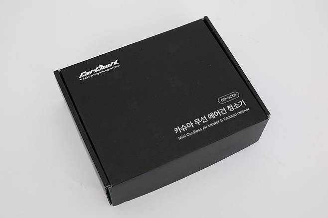 카슈아 에어건&미니 청소기 엔더스트는 검은색 박스에 담겨 있다. 박스 앞면에는 제품명만 적혀 있을 뿐, 제품 이미지는 그려져 있지 않아서 직접 열어보지 않고는 외형을 가늠할 수 없다.